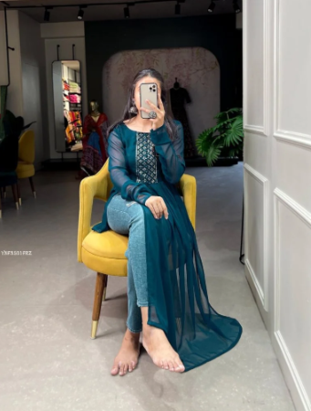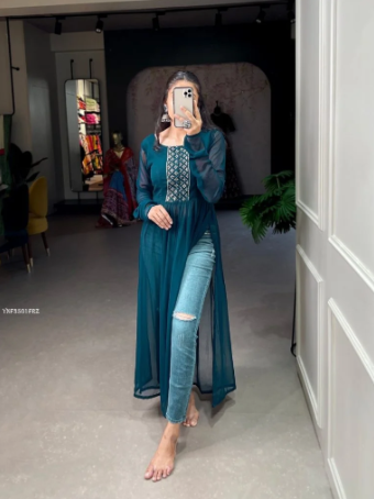Elevate your ethnic wardrobe with our Designer Georgette Sequin Embroidered Long Sleeve Naira Cut Kurti, a perfect blend of tradition and modern elegance. Crafted from premium georgette fabric, this kurti showcases exquisite sequin embroidery work that adds a touch of shimmer and sophistication to your look.