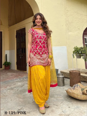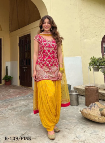 Embrace timeless Punjabi charm with this Designer Pink Embroidered Top and Mustard Patiala Suit from EduStyle, created for women who love vibrant tradition and modern grace.