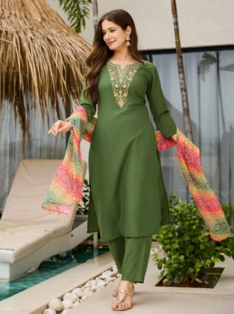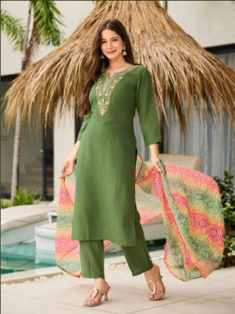 Step into elegance with this Elegant Mehndi Green Rayon Kurti Pant Dupatta Set, designed to bring together traditional grace and modern comfort. The stitched rayon kurti, adorned with delicate embroidery work, showcases timeless beauty with a touch of sophistication. Paired with a comfortable rayon bottom, it offers effortless movement and style for any occasion.
