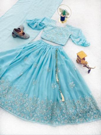 The blouse features intricate embroidery work and a back hook closure for a perfect fit, lined with micro cotton for soft comfort. The lehenga is beautifully embroidered with delicate patterns that give it a royal charm, while the faux georgette dupatta with fancy lace adds a touch of grace and sophistication.