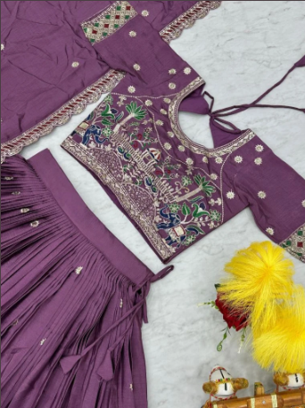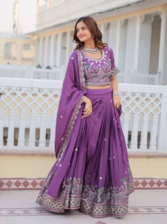 Complementing the look, the matching pure chinon dupatta is adorned with delicate embroidery and sequence work, enhancing its rich appeal. Ideal for weddings, festive occasions, and grand celebrations, this purple designer lehenga choli is a symbol of beauty, craftsmanship, and contemporary elegance — tailored to make every occasion unforgettable.